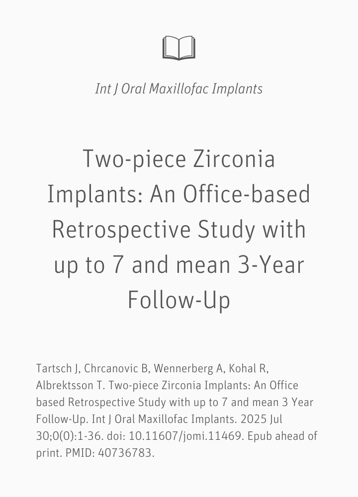 Tartsch J, Chrcanovic B, Wennerberg A, Kohal R, Albrektsson T. Two-piece Zirconia Implants: An Office-based Retrospective Study with up to 7 and mean 3-Year Follow-Up. Int J Oral Maxillofac Implants. 2025 Jul 30;0(0):1-36. doi: 10.11607/jomi.11469. Epub ahead of print. PMID: 40736783.